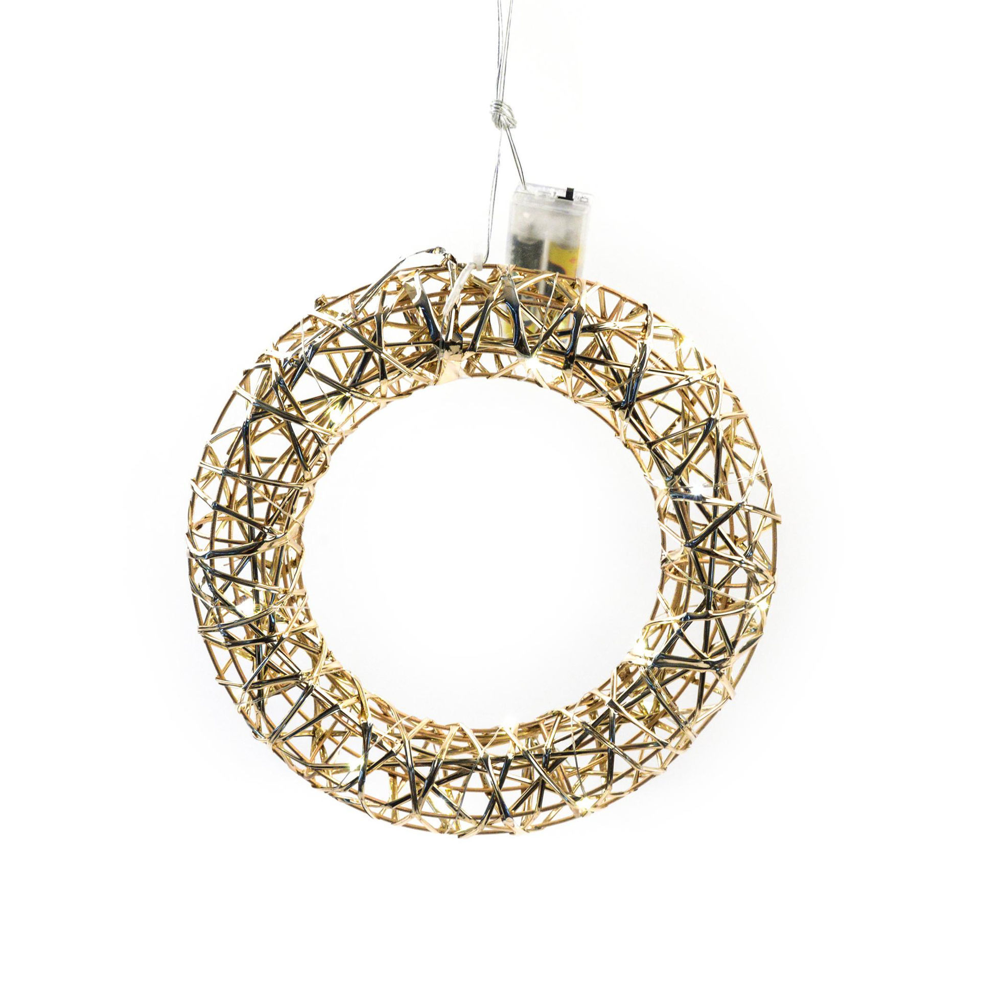 Corona oro in metallo con 20 luci LED a batteria (2xAA), dimensioni D.25xH.25 cm. Elegante decorazione natalizia luminosa da parete o porta.