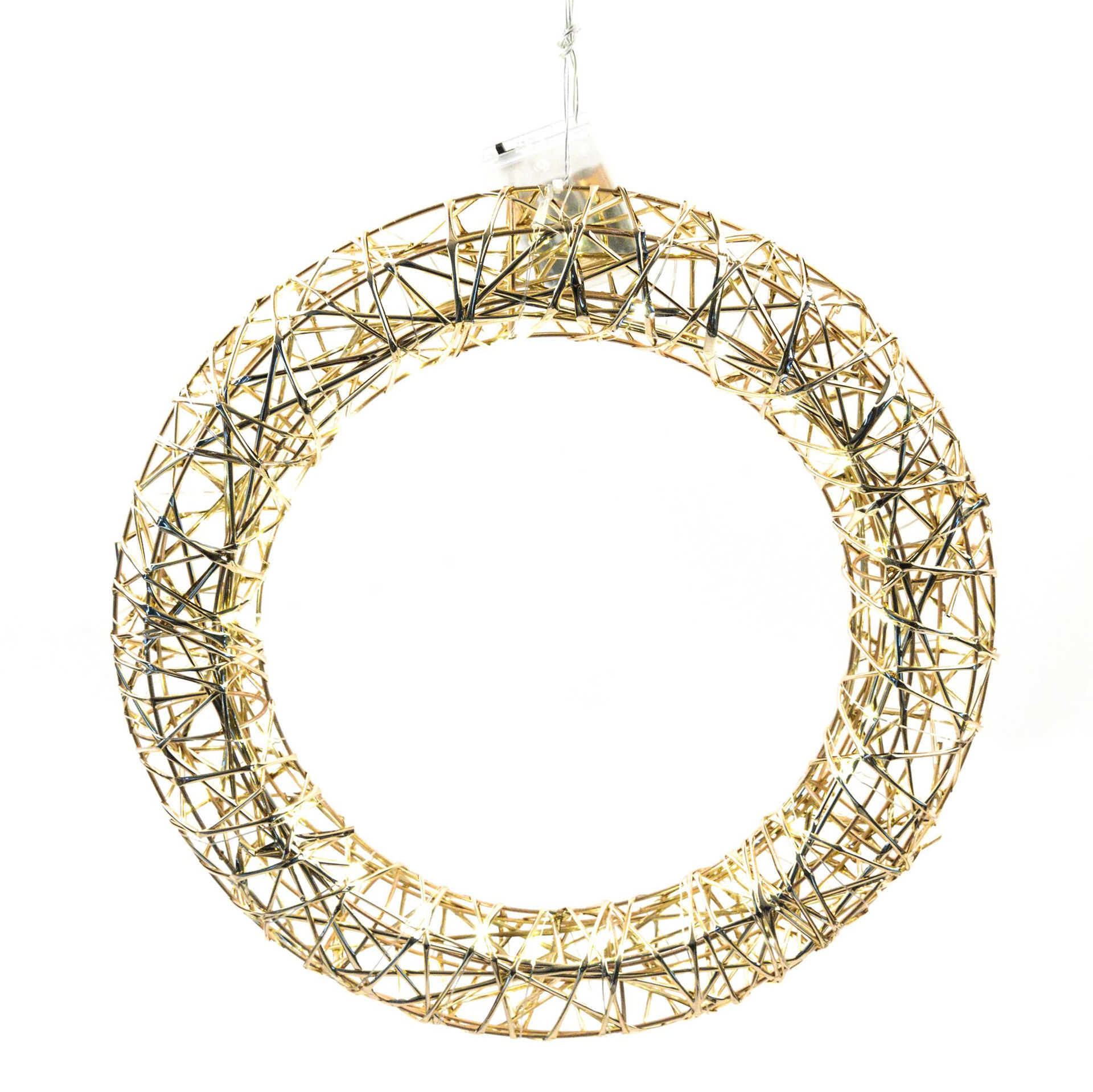 Corona oro in metallo con 50 luci LED a batteria (3xAA), dimensioni D.40xH.40 cm. Elegante ghirlanda luminosa natalizia da porta, parete o vetrina.