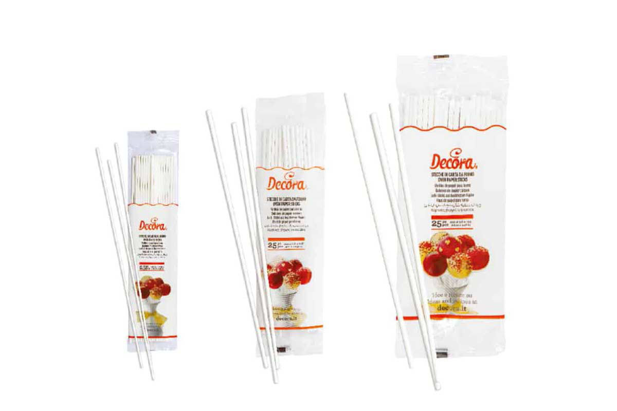 25 Stecche in Carta da Forno dimensioni 152 mm diametro 4 mm. Ideali per realizzare cake pops, biscotti su stecco e lecca lecca. Adatti alla cottura in forno ed idonei al contatto con alimenti.