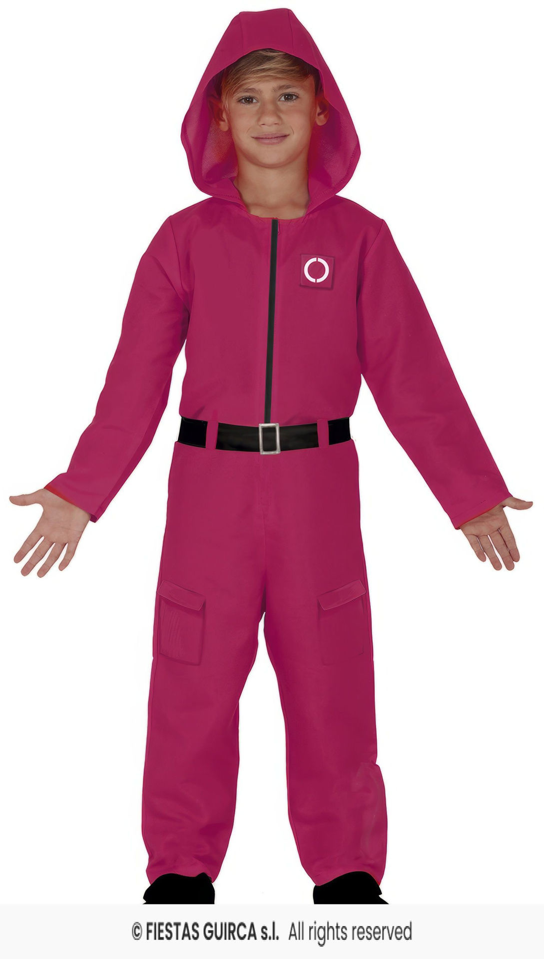 Tuta integrale rosa con cappuccio e simbolo “cerchio”, ispirata alla serie Squid Game. Taglia 7-9 anni: altezza 129–137 cm, petto 73 cm, vita 62 cm, bacino 75 cm.