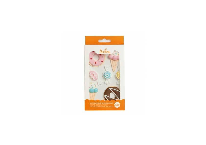 Decorazioni in zucchero pronte all’uso, realizzate a mano con coloranti naturali. Confezione da 7 pezzi assortiti per decorare torte, cupcakes, biscotti e dolcetti.