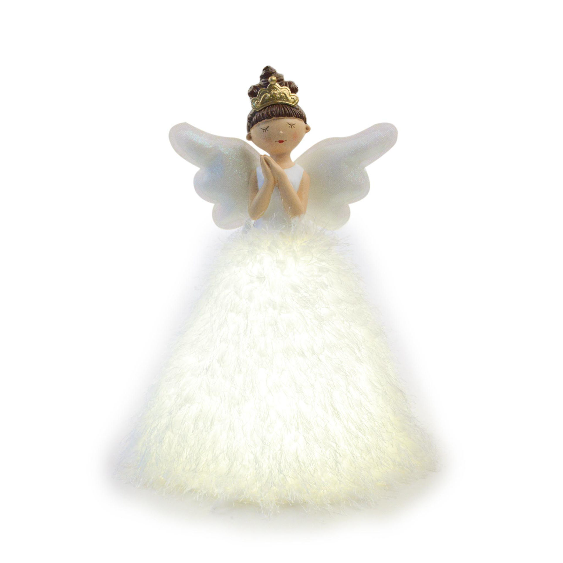 Fatina decorativa in plastica e tessuto con luci LED a batteria. Altezza 37 cm, elegante complemento luminoso per le feste natalizie.