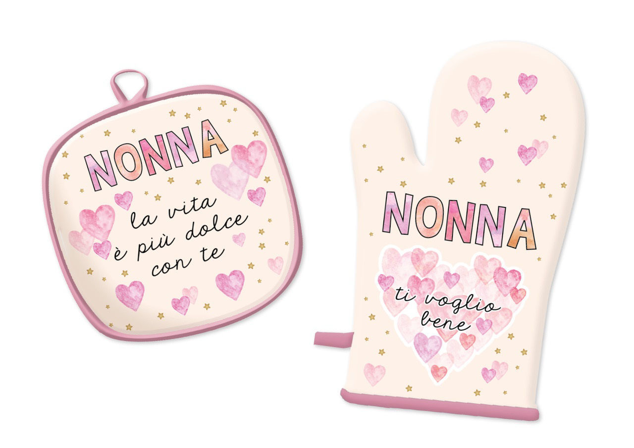 Set da cucina formato da guantone da forno e presina decorati con cuori e scritte affettuose “Nonna, la vita è più dolce con te”. Un regalo caloroso e pratico per celebrare la nonna.