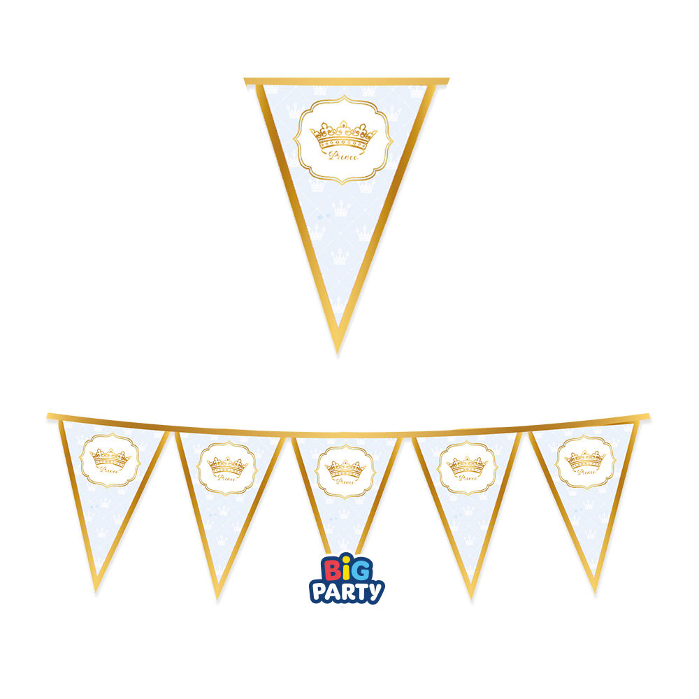Composto da bandierine in cartoncino rigido, pronte da appendere, ha una lunghezza di 3 metri e presenta grafiche coordinate con la linea “Prince” (corone, stelline, tonalità azzurre e oro).