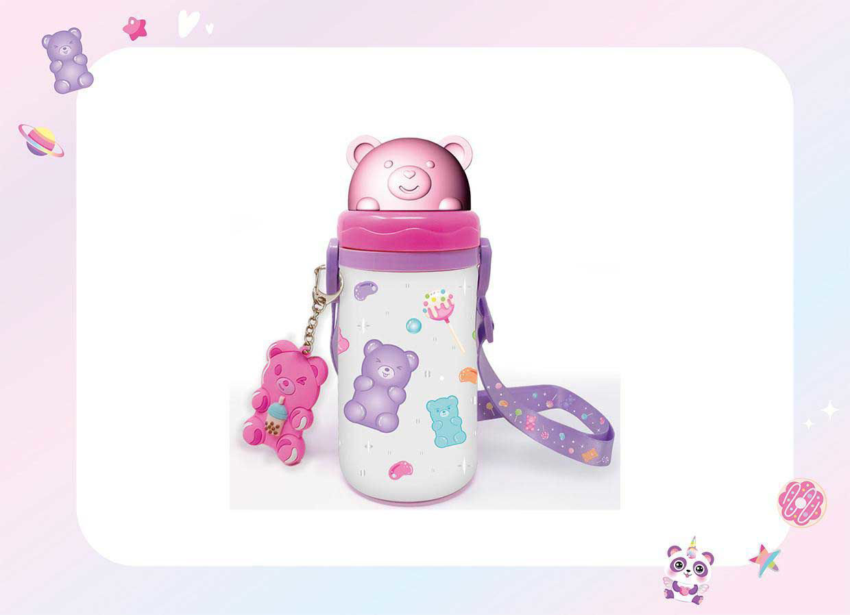Borraccia con cannuccia a scatto, coperchio girevole, targhetta porta nome e tracolla regolabile.