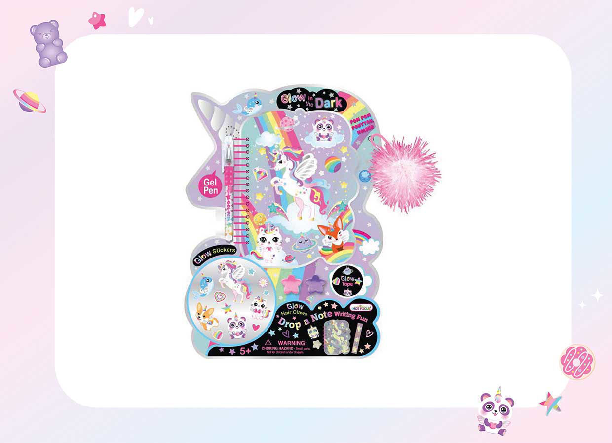 Scopri il magico mondo del Glow Set "Drop a Note Writing Fun" di Hot Focus, pensato per le piccole amanti dell’unicorno e delle sorprese brillanti!