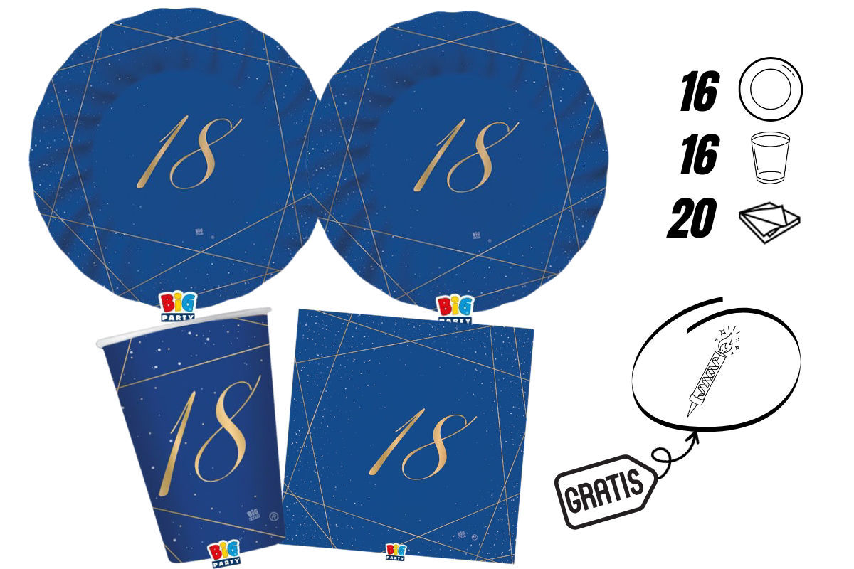 Kit party 18 anni colore blu completo per 16 persone con candelina flambè in omaggio, ideale per compleanni e feste eleganti.