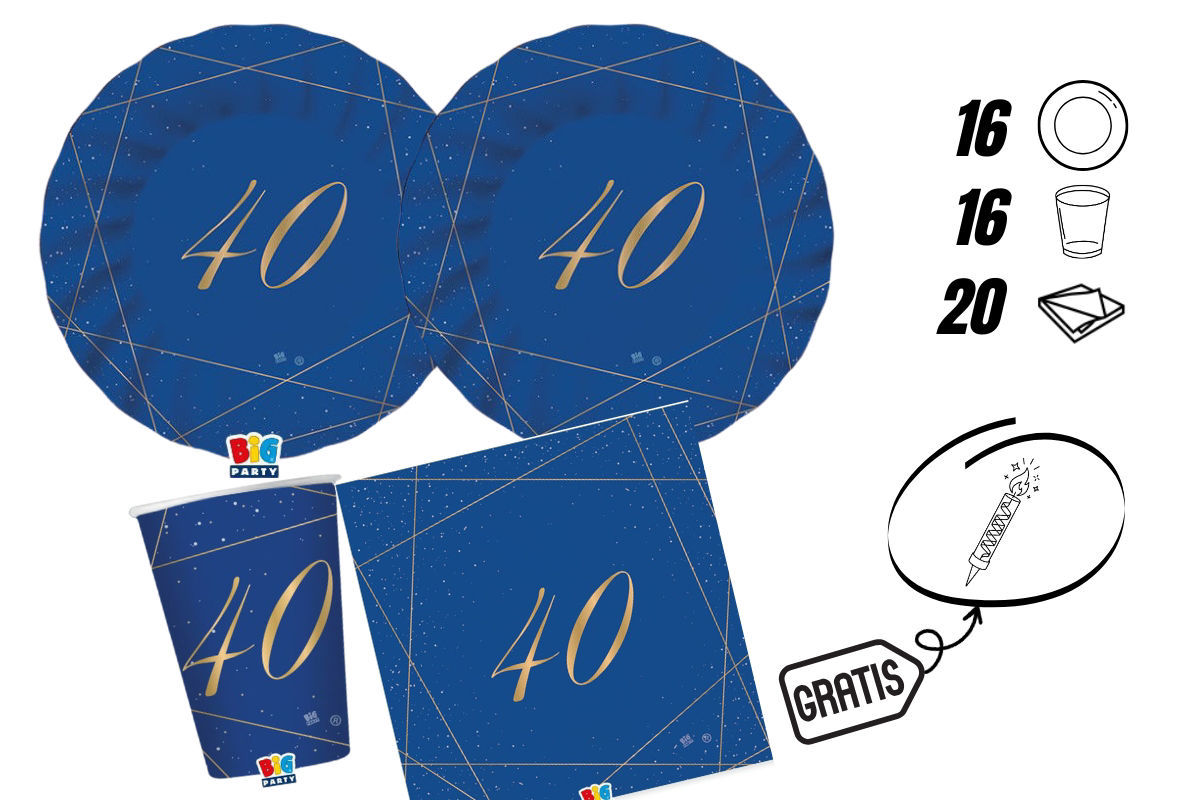 Kit party 40 anni colore blu e gold completo per 16 persone con candelina flambè in omaggio, ideale per compleanni eleganti e allestimenti scenografici.