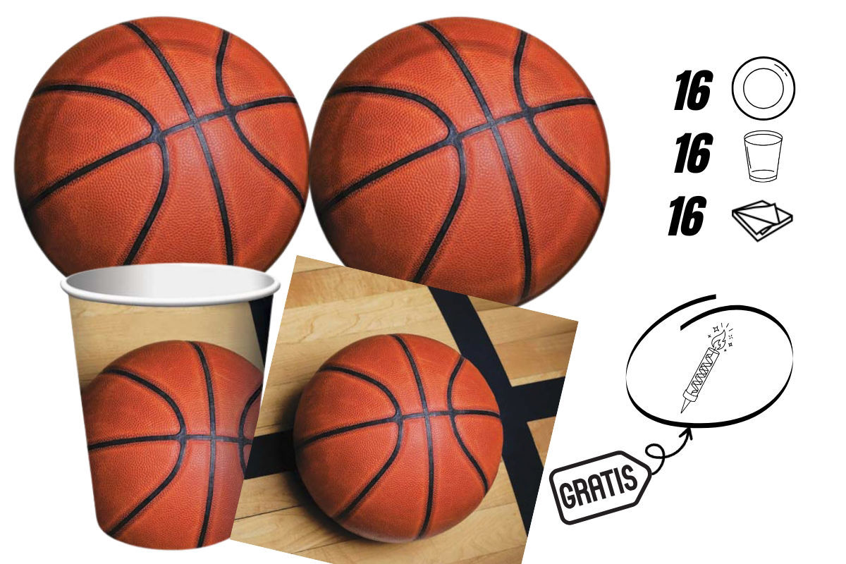 Kit party a tema Pallacanestro completo per 16 persone con candelina flambè in omaggio, ideale per compleanni e feste a tema sportivo.