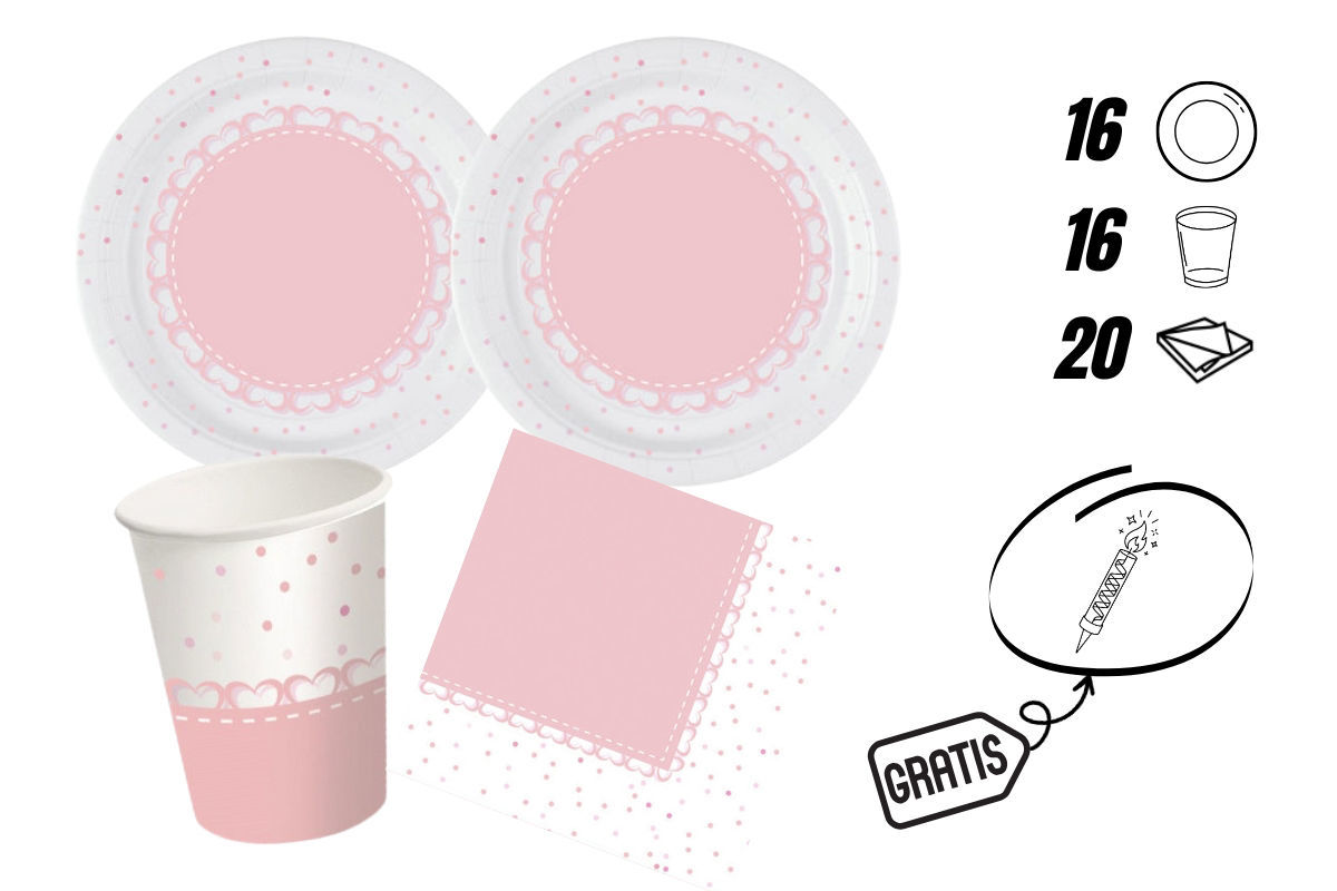 Il set include: 16 piatti da 18 cm, 16 bicchieri da 250 ml e 20 tovaglioli da 33x33 cm. Tutti gli elementi sono coordinati con grafiche a tema cuori rosa, perfette per creare un’atmosfera dolce e festosa.