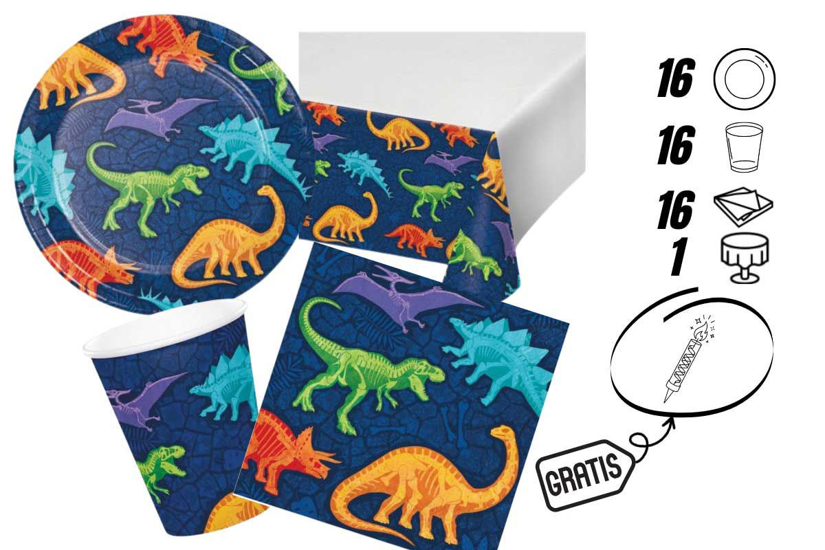 Il kit include: 16 piatti da 18 cm, 16 bicchieri da 250 ml, 16 tovaglioli da 33x33 cm e Tovaglia in plastica 120x220 cm Dino Dig. Tutti gli elementi sono decorati con grafiche a tema Dino Dig, perfette per creare un’atmosfera coinvolgente e divertente.