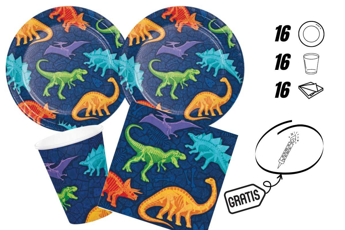 Il kit include: 16 piatti da 18 cm, 16 bicchieri da 250 ml e 16 tovaglioli da 33x33 cm. Tutti gli elementi sono decorati con grafiche a tema Dino Dig, perfette per creare un’atmosfera coinvolgente e divertente.