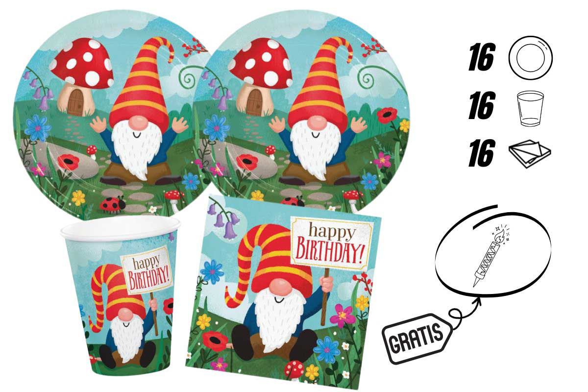 Kit festa tema gnomi per 16 persone con candelina flambè in omaggio, ideale per compleanni e party a tema.