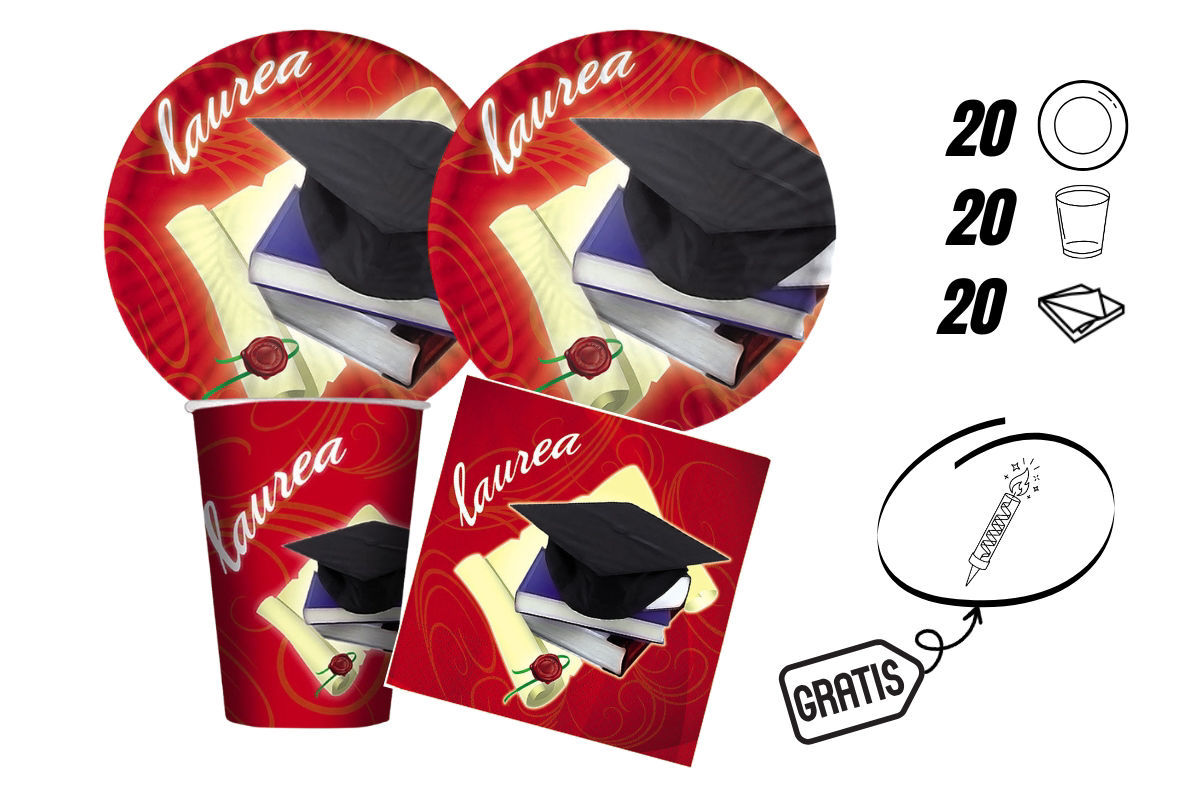 Il kit festa laurea 60 pezzi è la soluzione ideale per organizzare una festa di laurea in modo pratico e coordinato. Troverai 20 piatti in carta da 18 cm, 20 bicchieri in carta da 200 cc, e 20 tovaglioli da 33x33 cm.