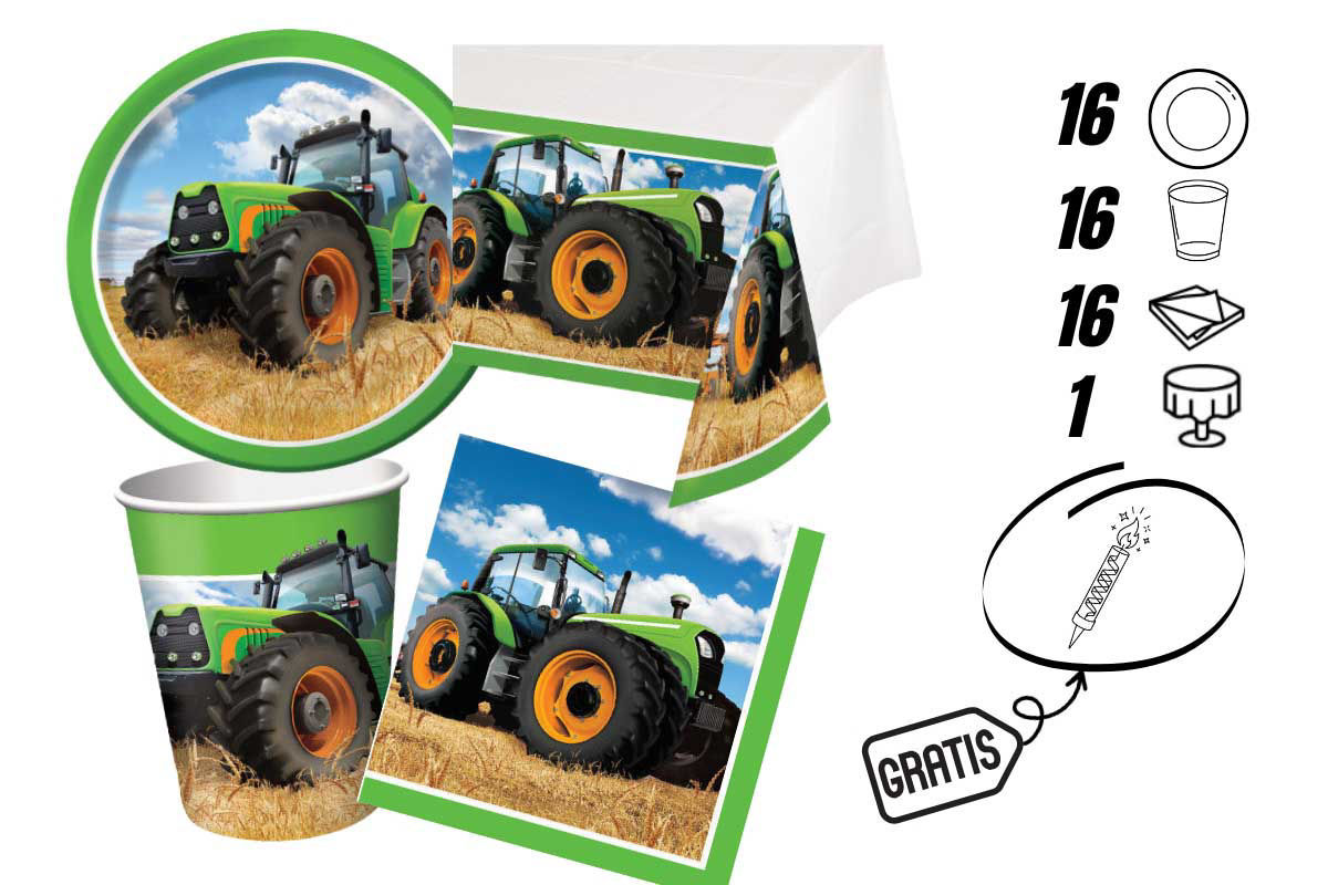 Il kit include: 16 piatti da 18 cm, 16 bicchieri da 250 ml, 20 tovaglioli da 33x33 cm e 1 tovaglia in carta da 120x180 cm. Tutti gli elementi sono decorati con grafiche a tema trattore, perfette per creare un’atmosfera divertente e originale.