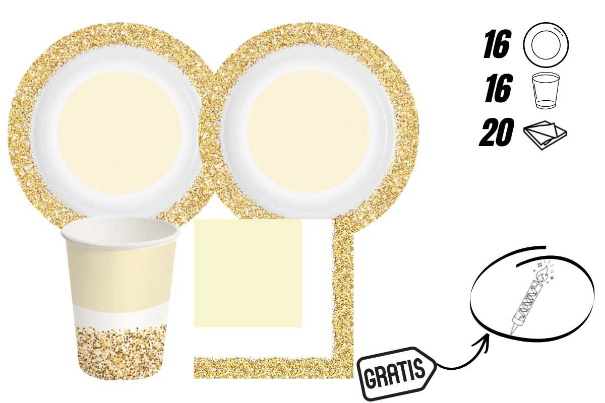 Il kit include: 16 piatti da 19 cm, 16 bicchieri da 250 ml e 20 tovaglioli da 33x33 cm. Tutti gli elementi sono coordinati con grafiche effetto glitter oro, perfette per creare un’atmosfera brillante e festosa.