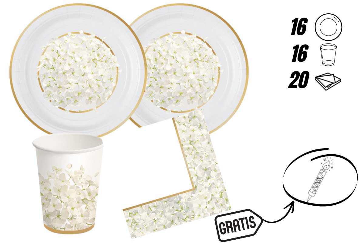 Il kit include: 16 bicchieri da 250 ml, 16 piatti da 18 cm e 20 tovaglioli da 33x33 cm. Tutti gli elementi sono coordinati con grafiche a tema ortensia, perfette per creare un’atmosfera romantica e curata nei dettagli.