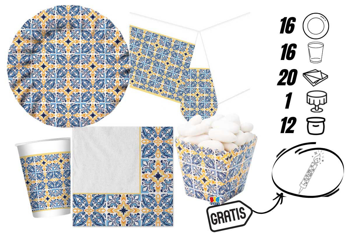 Il kit include: 16 bicchieri da 200 cc, 16 piatti da 20 cm, 20 tovaglioli da 33x33 cm, 1 tovaglia da 140x270 cm e 12 sweety box, perfette per contenere dolci, confetti o gadget. Il design ispirato allo stile Positano dona un tocco elegante e distintivo all’allestimento.