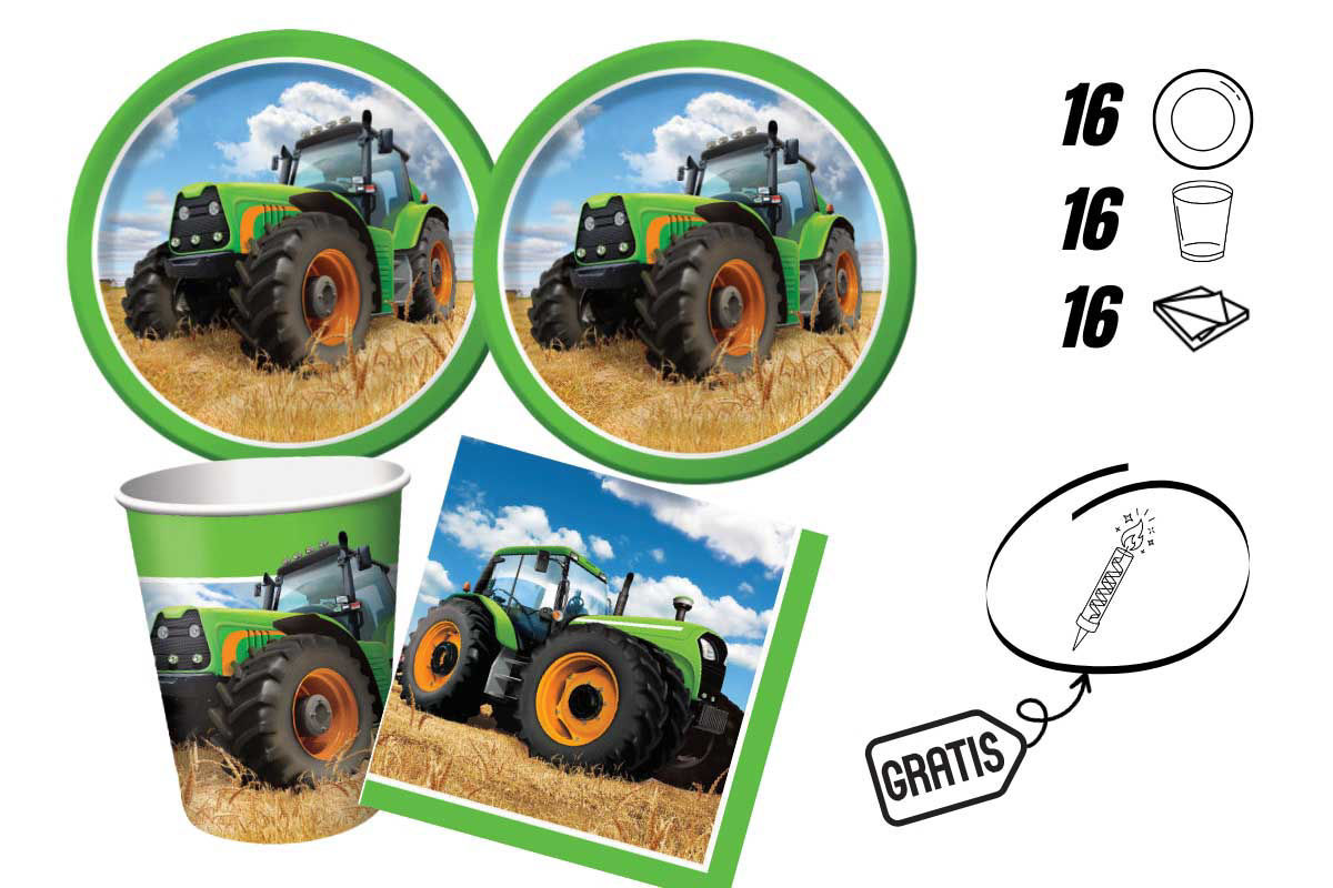 Il kit include: 16 piatti da 18 cm, 16 bicchieri da 250 ml e 20 tovaglioli da 33x33 cm. Tutti gli elementi sono decorati con grafiche a tema trattore, perfette per creare un’atmosfera divertente e originale.