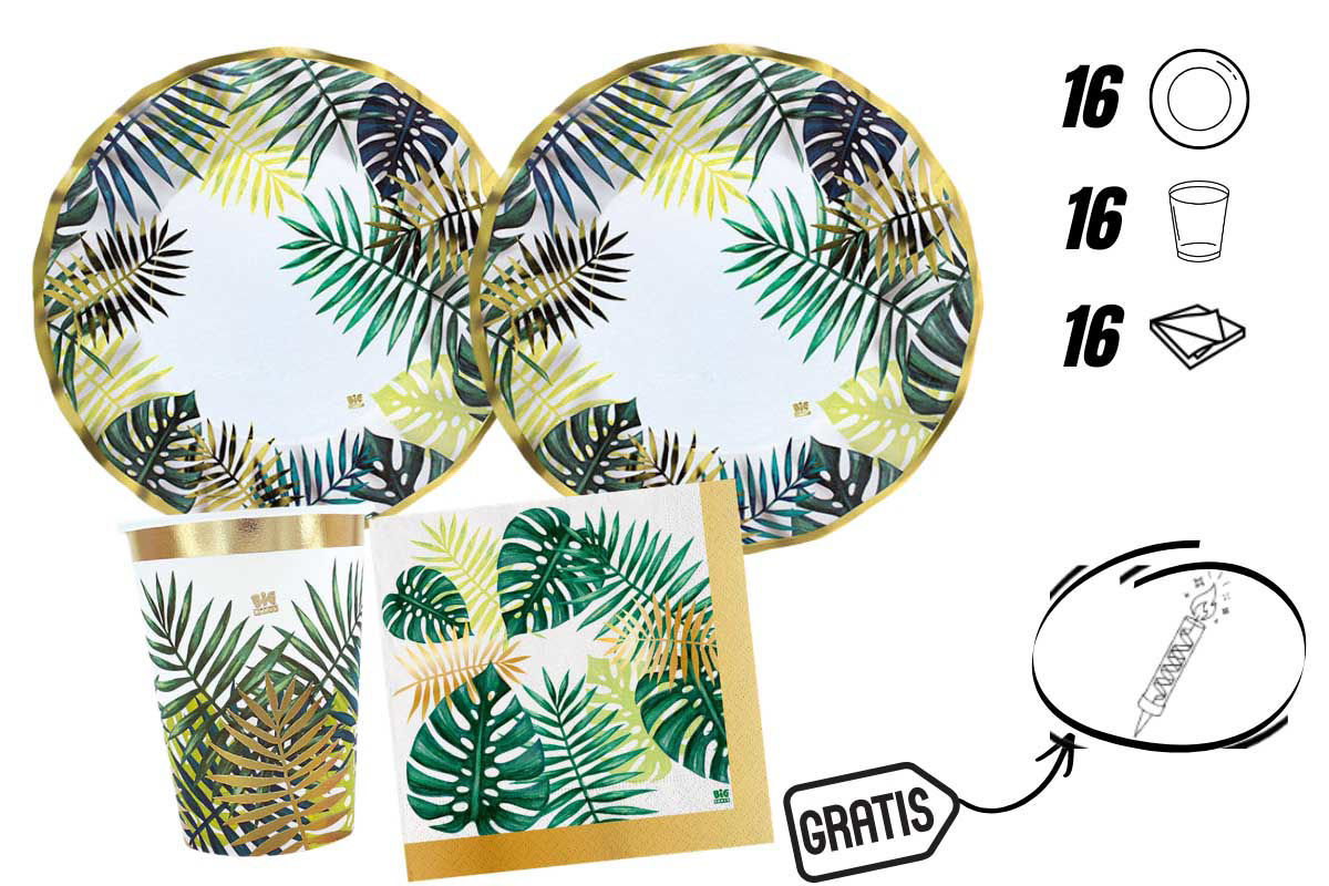 Il kit include: 16 bicchieri da 200 cc, 16 piatti da 20 cm e 20 tovaglioli da 33x33 cm. Tutti gli elementi sono coordinati con grafiche a tema tropicale, perfette per creare un’atmosfera allegra e festosa.