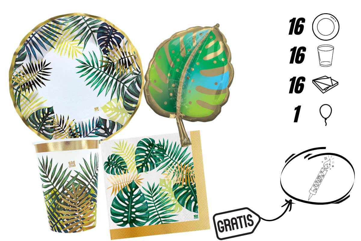 Il kit include: 16 bicchieri da 200 cc, 16 piatti da 20 cm e 20 tovaglioli da 33x33 cm, palloncino Supershape 55 x 76 cm Foglia di Palma. Tutti gli elementi sono coordinati con grafiche a tema tropicale, perfette per creare un’atmosfera allegra e festosa.