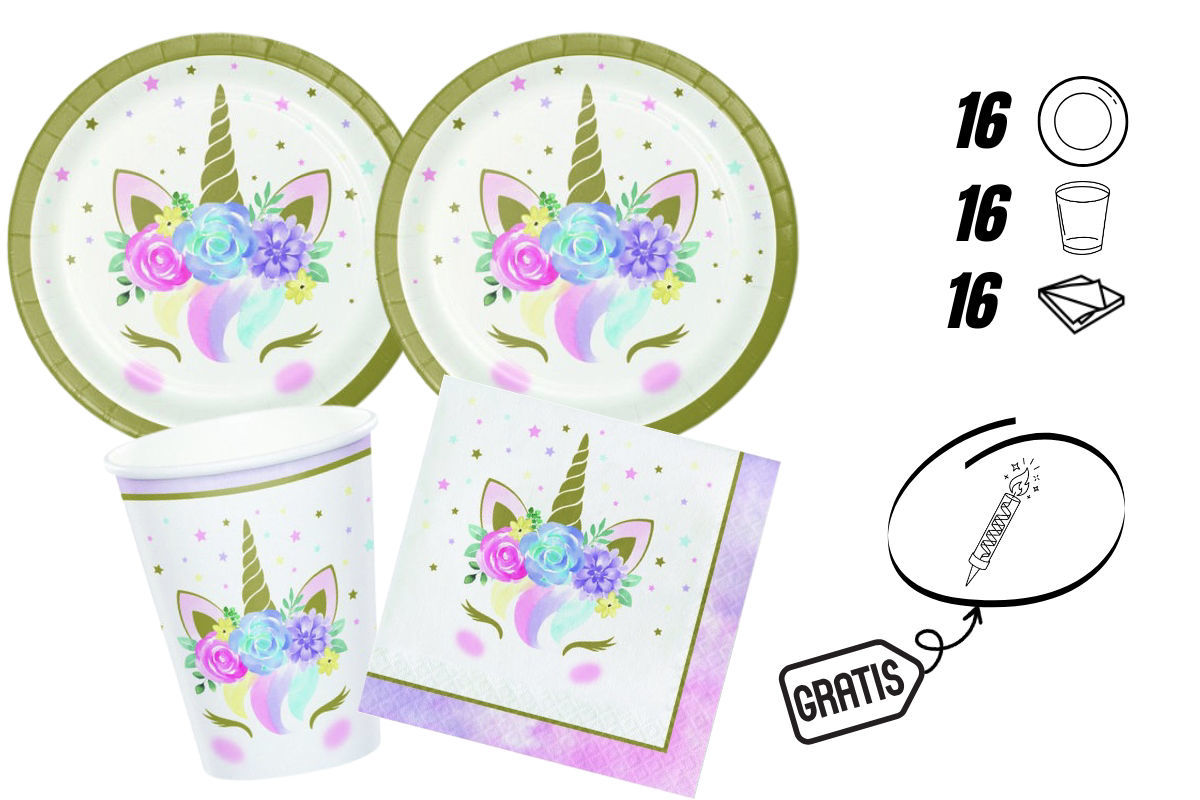Il set include: 16 piatti da 17,4 cm, 16 bicchieri da 266 ml e 32 tovaglioli da 33x33 cm. Tutti gli elementi sono coordinati con grafiche a tema unicorno baby, perfette per creare un’atmosfera magica e festosa.