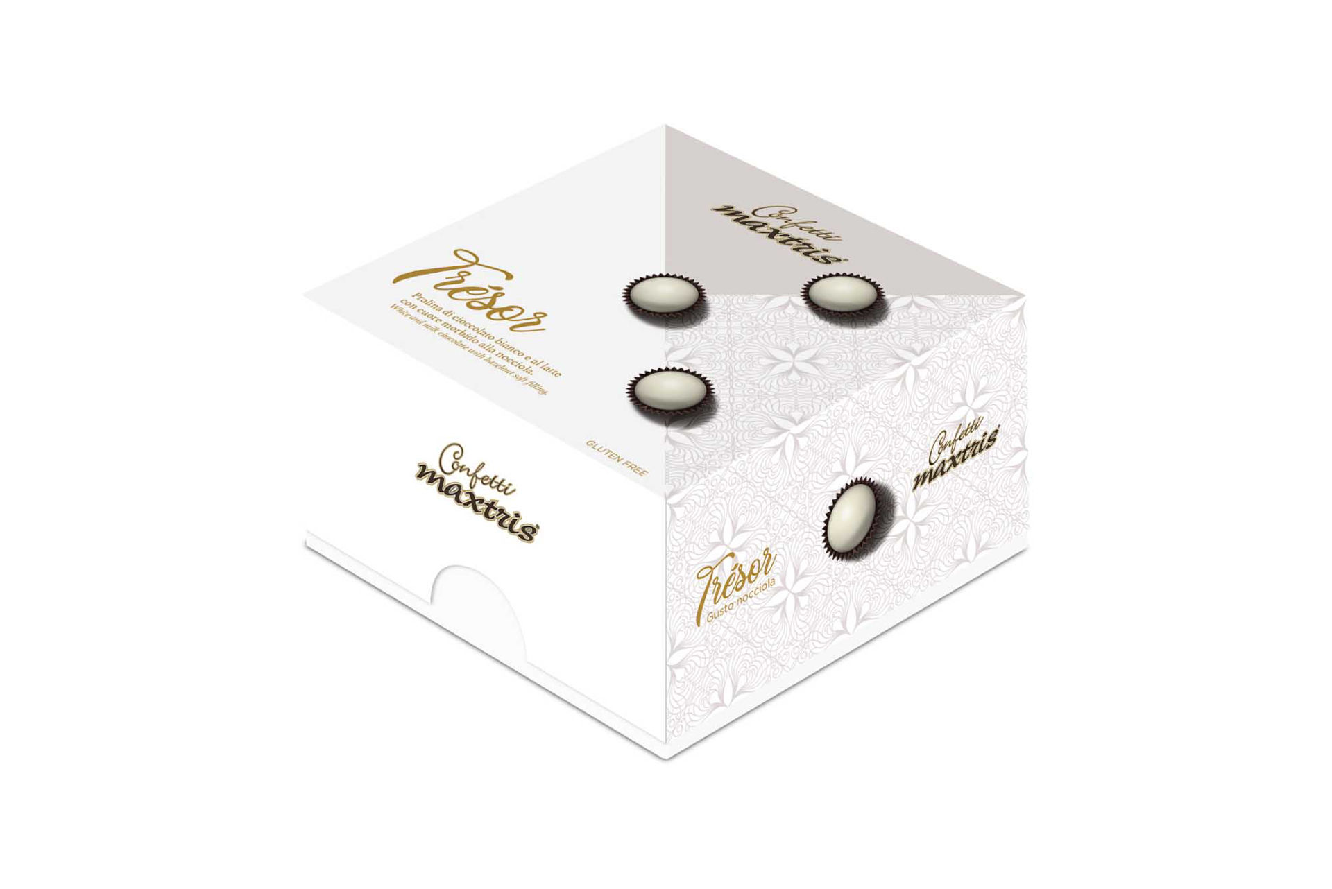 Maxtris Trésor Bianco, pralina raffinata di cioccolato bianco e al latte con cuore morbido alla nocciola, ideale per ogni occasione speciale.