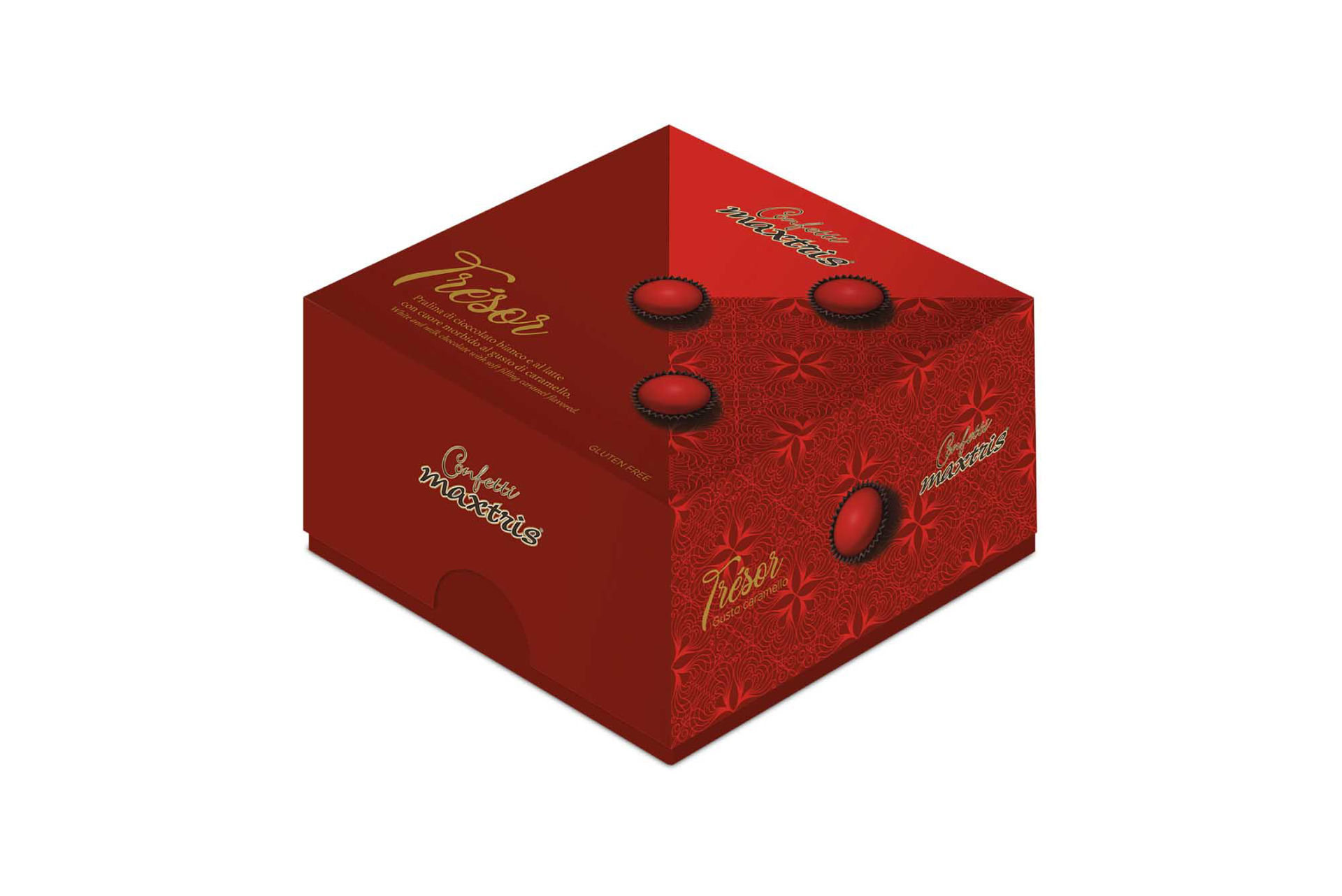 Maxtris Trésor Rosso, pralina al cioccolato bianco e al latte con cuore morbido alla nocciola, elegante e ideale per cerimonie e momenti speciali.