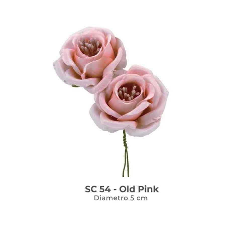 Mazzetto di 6 rose con pistilli in rosa antico, diametro 5 cm, perfetto per completare bomboniere e sacchetti regalo. Elegante e raffinato, aggiunge un tocco romantico a matrimoni, battesimi, comunioni e altre cerimonie speciali, impreziosendo confezioni e decorazioni.