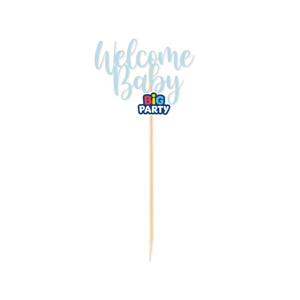 Set 5 mini topper sagomati Welcome Baby azzurri – perfetti per baby shower, nascita e battesimo maschile. Firmati Big Party.
