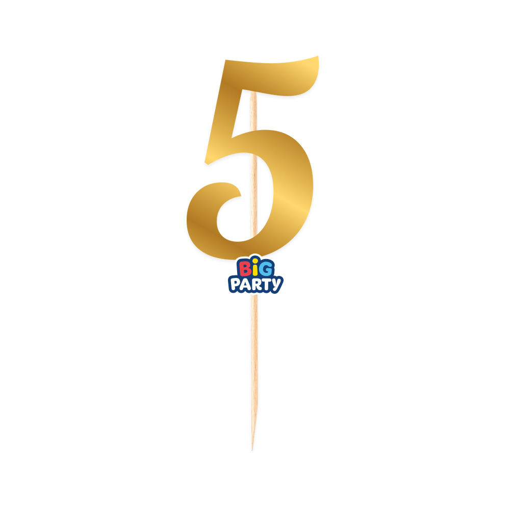 Topper numero 5 oro metal di Big Party. Numero 7 cm, altezza totale 15 cm con stecco. Ideale per torte di compleanno o eventi numerici.