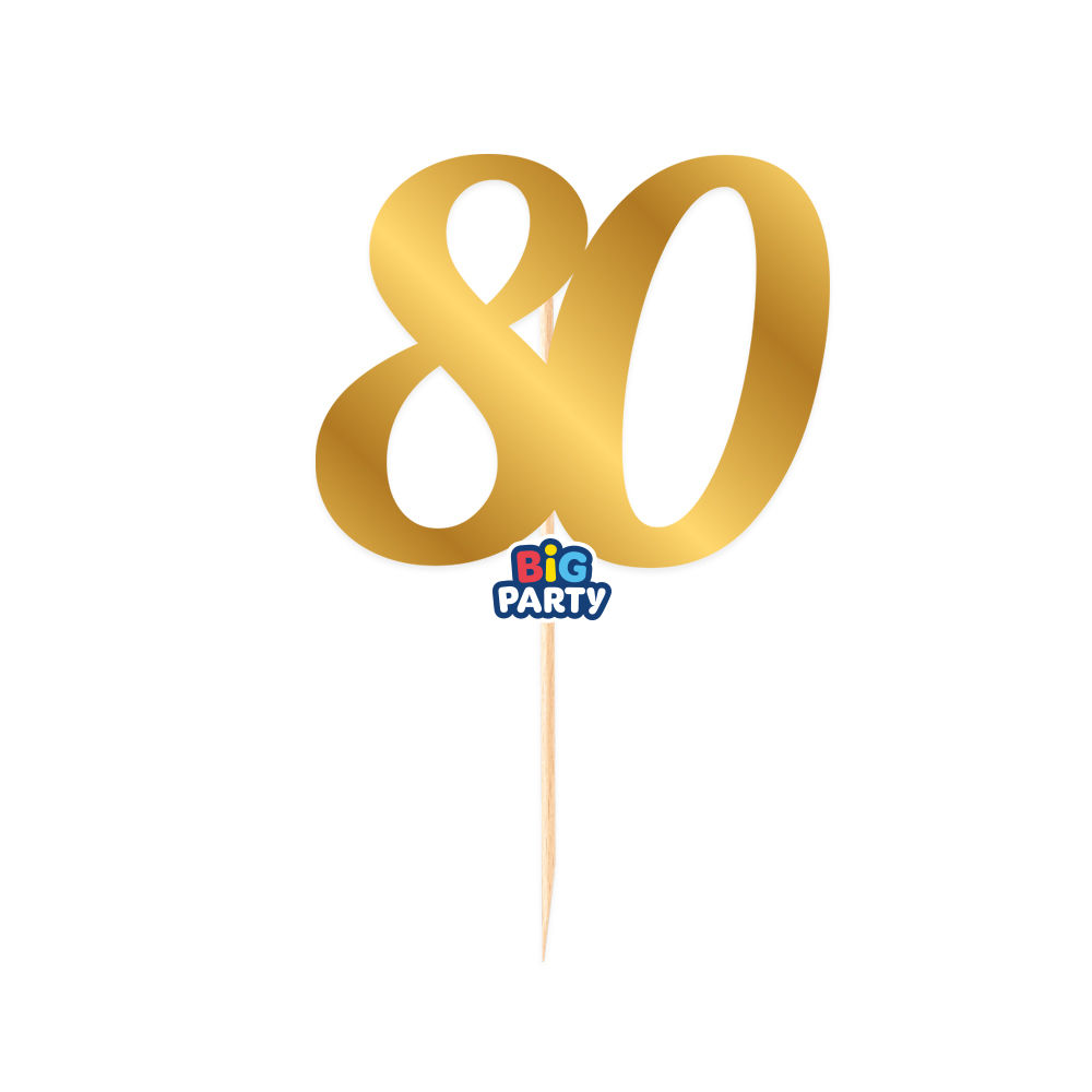 Topper numero 80 oro metal firmato Big Party. Numero alto 7 cm, altezza complessiva con stecco 15 cm. Ideale per torte eleganti da compleanno o anniversario.