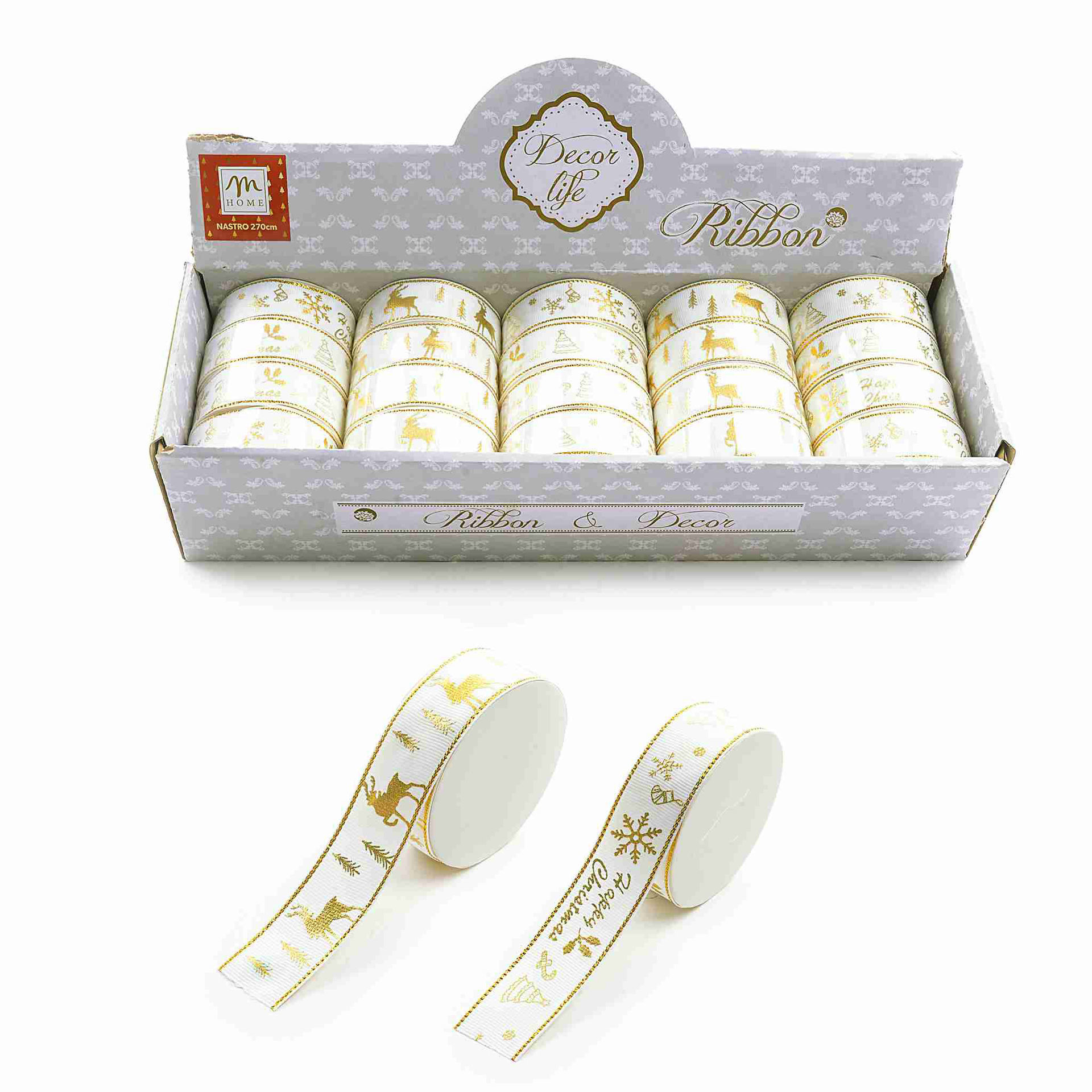 Nastro natalizio in tessuto bianco con decorazioni dorate a tema feste, ideale per pacchetti regalo, alberi di Natale e addobbi. Vendita singola.