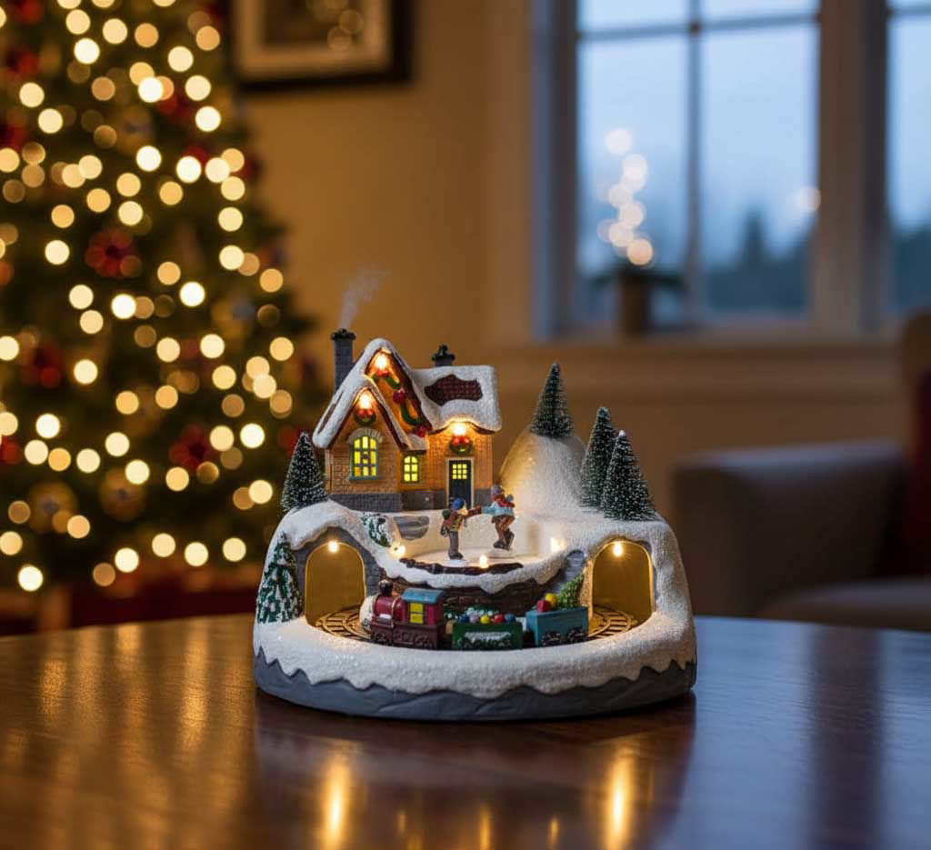 Questo paesaggio natalizio combina luci LED calde, musica festiva e movimento dinamico per creare una scenografia ricca di atmosfera. La casetta innevata è illuminata da finestre luminose, mentre il trenino colorato percorre un binario circolare che passa anche sotto un piccolo tunnel montano. Dettagli come alberi innevati, pupazzi di neve e personaggi invernali rendono la scena vivida e decorativa. Perfetto per arricchire villaggi natalizi, arredamenti stagionali o come centrotavola tematico, aggiunge magia e fascino a qualsiasi ambiente.