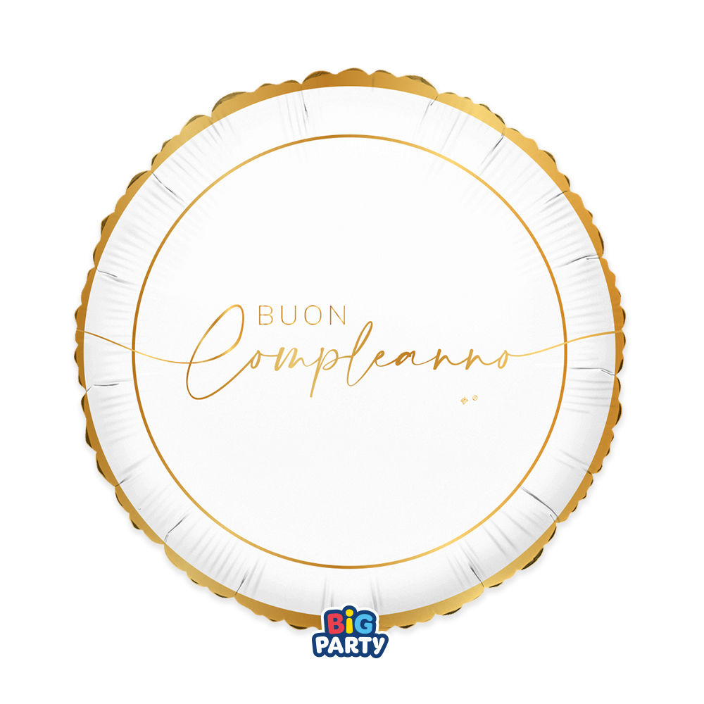 Realizzato in foil (mylar) resistente, ha forma tonda e misura 45 cm (18"), con una raffinata grafica color oro e scritta centrale “Buon Compleanno”.