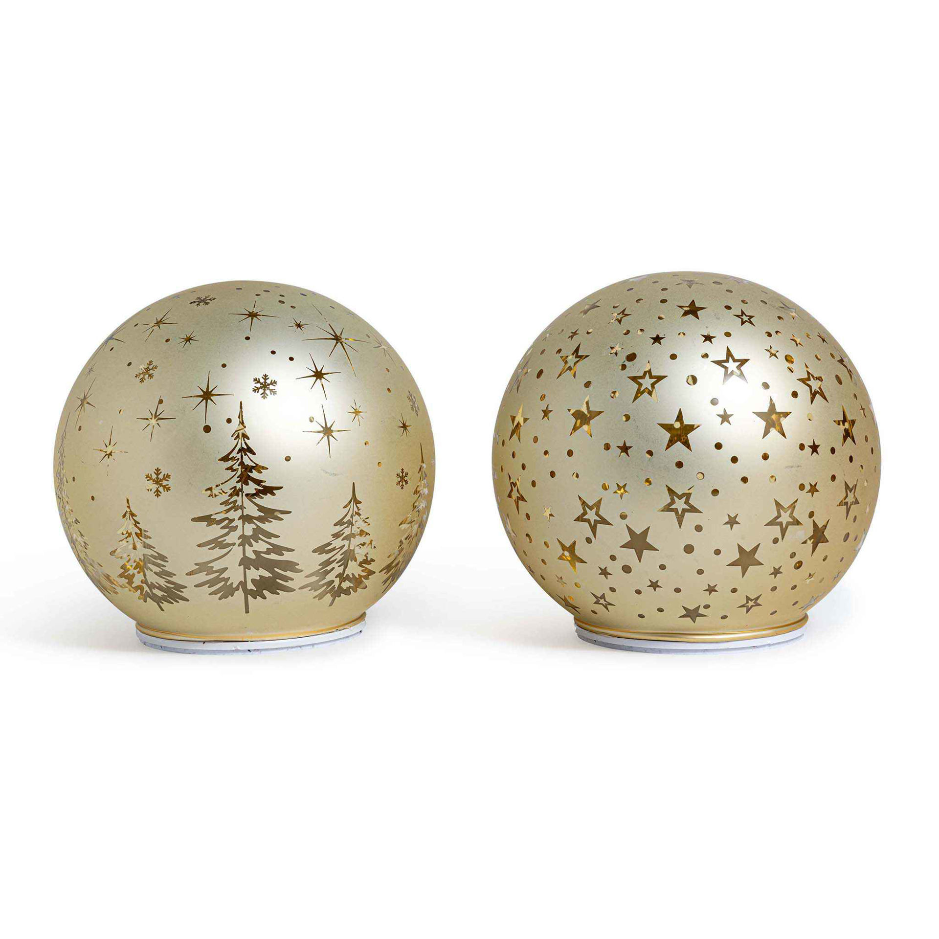 Palla di Natale oro in vetro rotante con luci LED, funzionamento a batteria, design assortiti eleganti e luminosi, in scatola regalo.