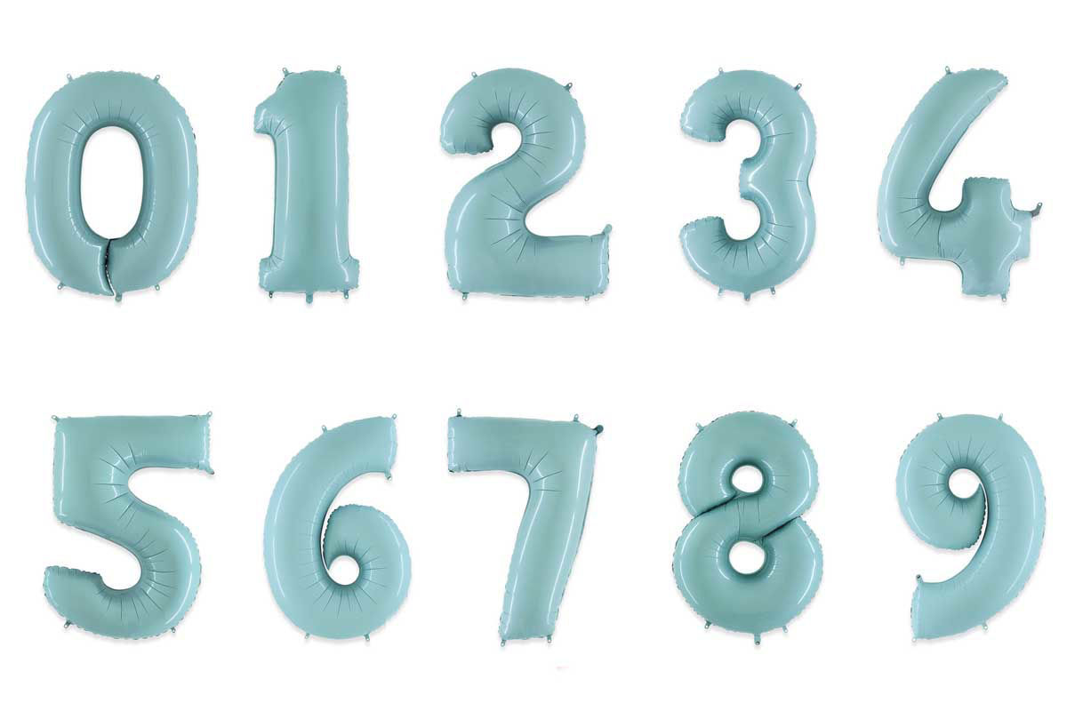 Palloncini Mylar 102 cm colore celeste numeri da 0 a 9. Ideali per compleanni, baby shower e feste eleganti. Venduti singolarmente per comporre qualsiasi cifra.