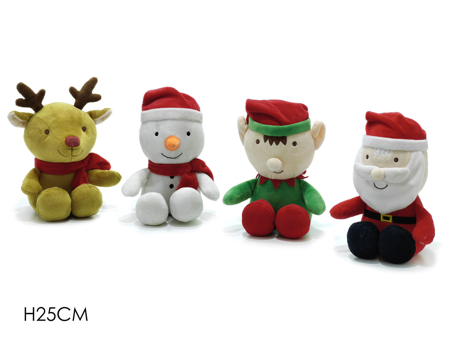 Personaggio natalizio seduto in peluche alto 25 cm. Disponibile in 4 soggetti assortiti (renna, pupazzo di neve, elfo e Babbo Natale). Vendita singola con spedizione casuale in base alla disponibilità.