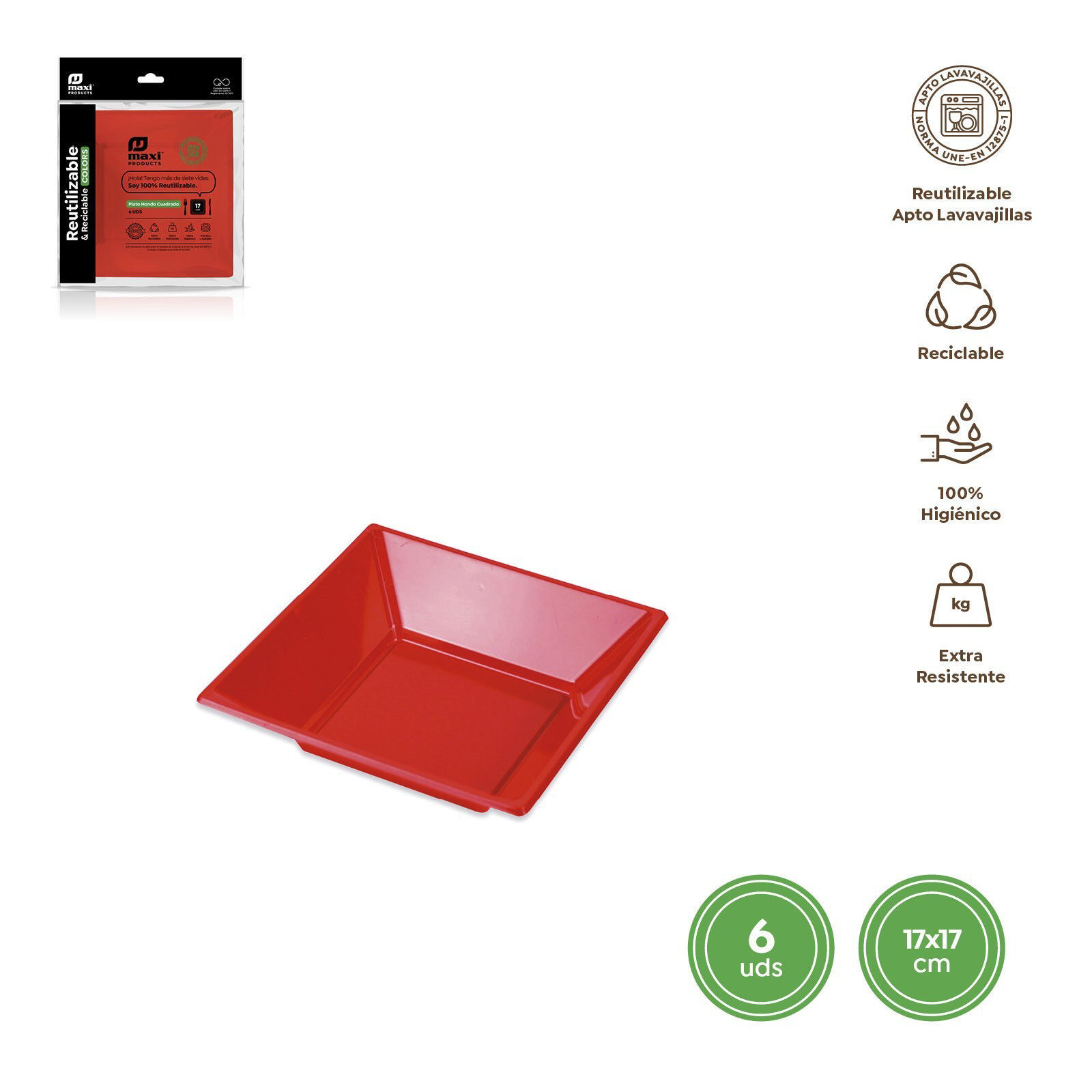 Piatti fondi quadrati riutilizzabili di colore rosso, misura 17×17 cm, realizzati in polistirene resistente. Ideali per feste, catering ed eventi, offrono un tocco elegante e pratico alla tavola. Confezione da 6 pezzi.