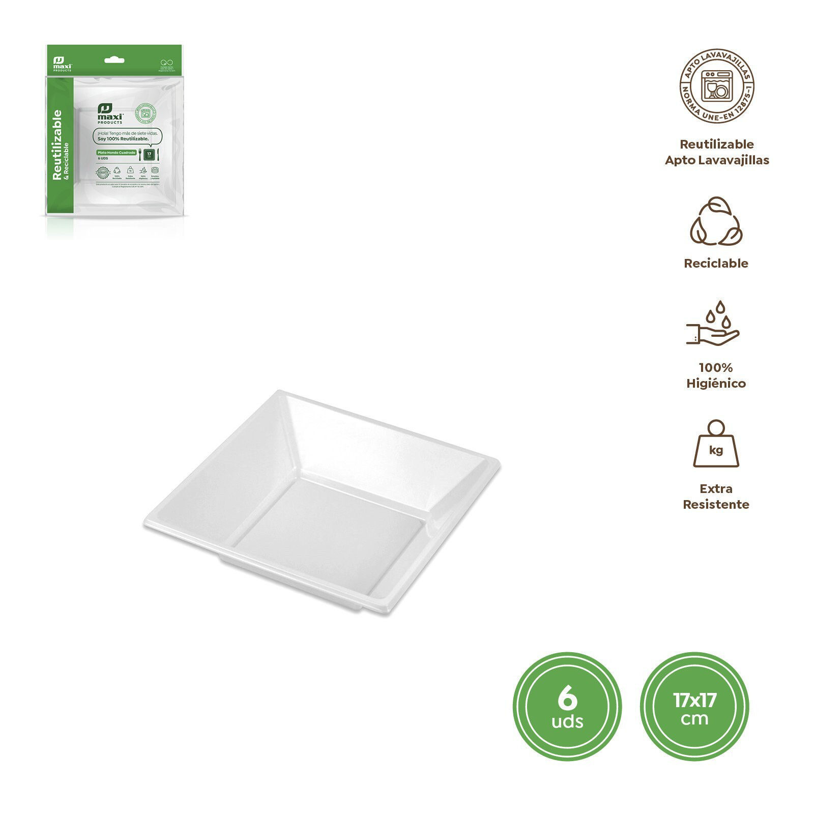 Piatti fondi quadrati bianchi riutilizzabili da 17×17 cm in plastica resistente, ideali per feste, catering ed eventi. Eleganti e pratici, perfetti per servire primi piatti. Confezione da 6 pezzi.