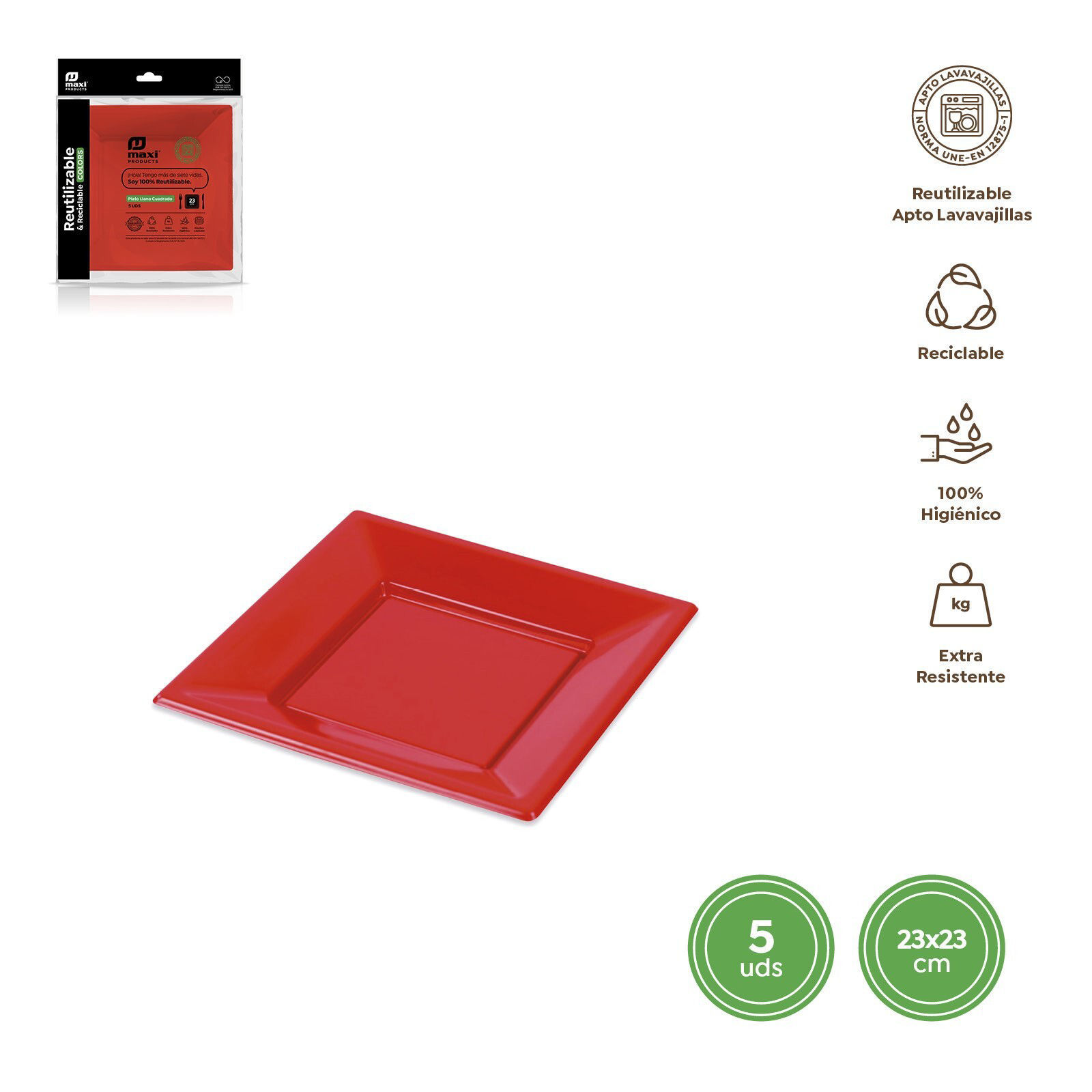 Piatti quadrati riutilizzabili di colore rosso da 23×23 cm, realizzati in polistirene resistente. Ideali per catering, feste ed eventi, offrono un tocco elegante e pratico per servire portate principali. Confezione da 5 pezzi.