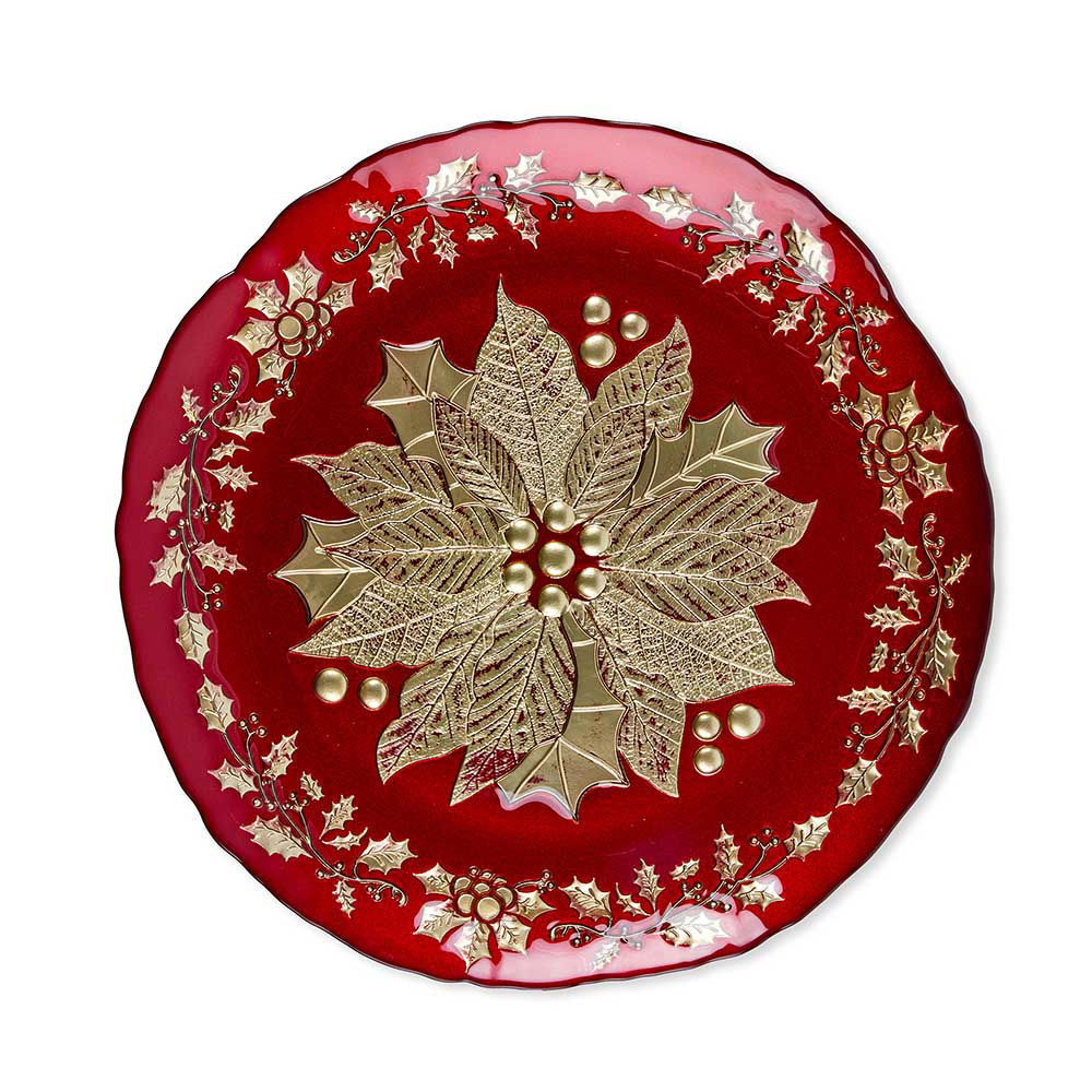 Piatto tondo decorato in vetro rosso e oro, diametro 33 cm. Elegante centrotavola o sottopiatto per decorazioni natalizie raffinate.