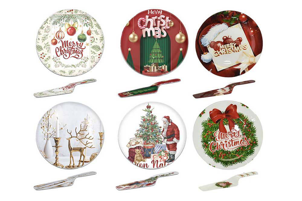 Piatto tondo da 30 cm con paletta abbinata, ideale per servire panettone e dolci natalizi. Confezione regalo, disponibile in 6 decorazioni assortite, venduto singolarmente.