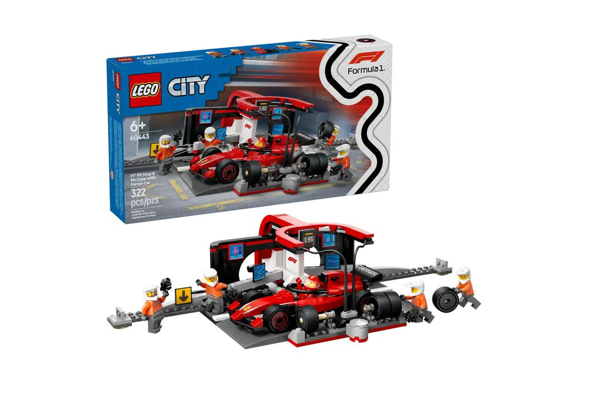 Il set LEGO® City 60443 porta l’azione dei box nel gioco dei bambini con un pit stop Ferrari F1® completo di monoposto, meccanici e funzioni per cambi gomme super veloci.