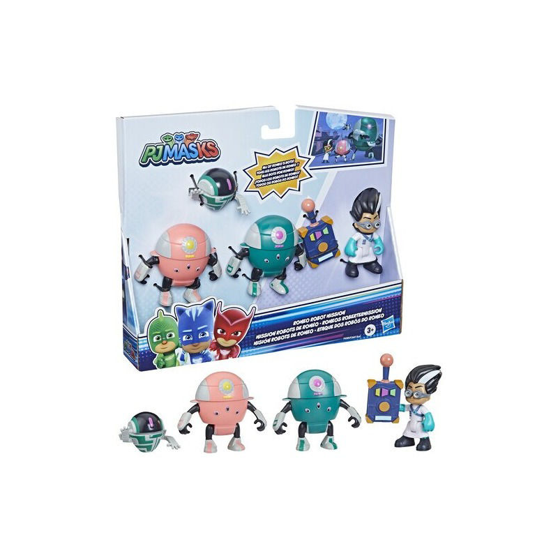 Set di Action Figure "Missione Robot di Romeo" dei PJ Masks, prodotto da Hasbro. Questo set include quattro personaggi articolati: Romeo, il genio malvagio, e tre dei suoi robot: Robot, Robette e Fly Bot. Ogni figura è dettagliata e ispirata alla serie animata "PJ Masks - Super Pigiamini", permettendo ai bambini di ricreare le avventure dei loro personaggi preferiti. Il set è compatibile con la tecnologia Hero ID di Hasbro, che consente interazioni con luci e suoni quando utilizzato con altri giocattoli PJ Masks compatibili. Consigliato per bambini dai 3 anni in su