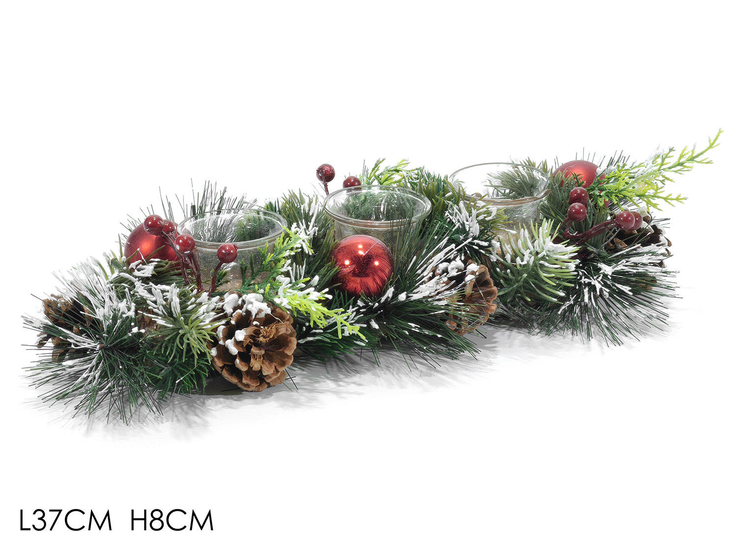 Portacandele natalizio con decorazioni di bacche rosse, pigne e rami innevati. Lunghezza 37 cm con 3 portavoti in vetro.
