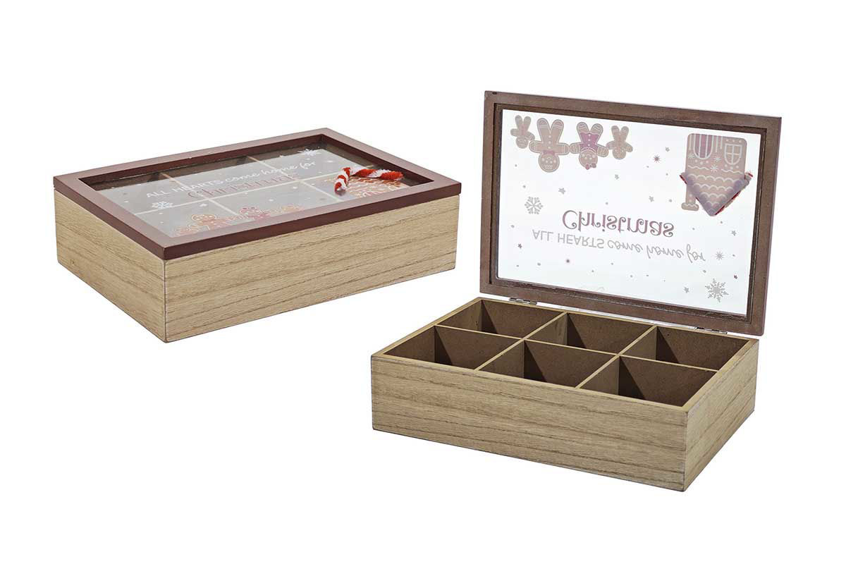 Portatisane natalizio in legno da 24 cm con 6 scomparti interni e coperchio decorato a tema Natale.