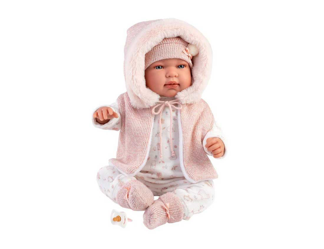 Bambola Reborn Tina da 44 cm con corpo morbido, completo rosa invernale, giacca con cappuccio e cappellino coordinato.