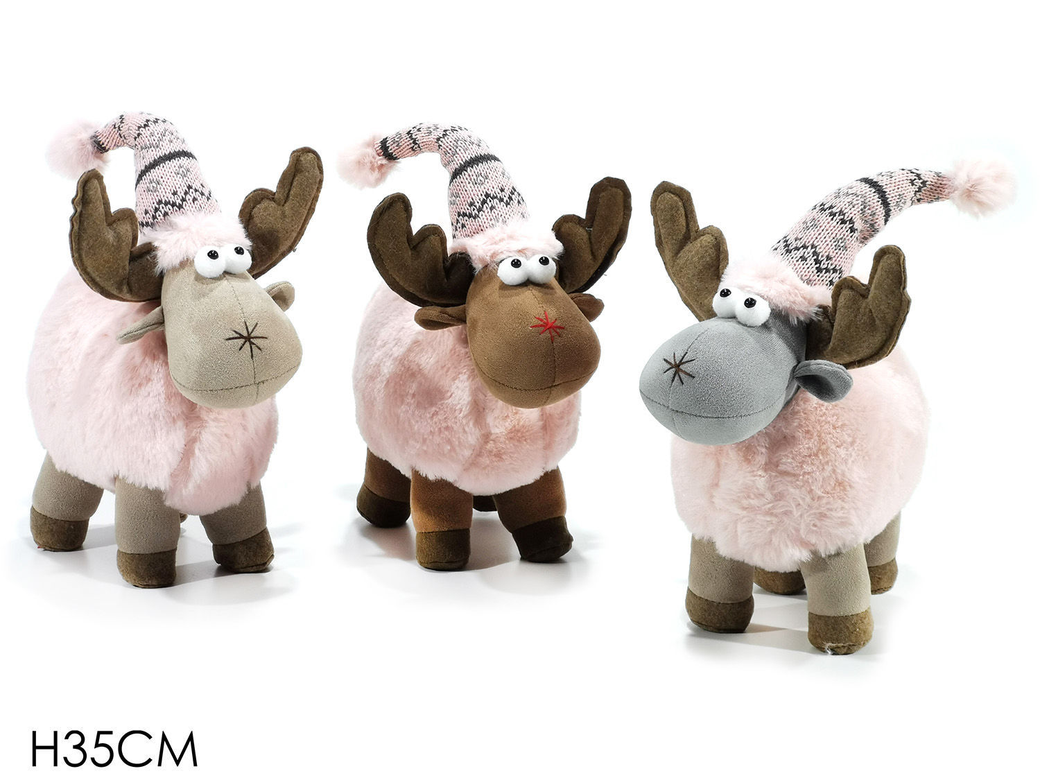 Renna natalizia in stoffa alta 35 cm con morbido cappello rosa. Vendita singola con soggetto assortito spedito in base alla disponibilità.