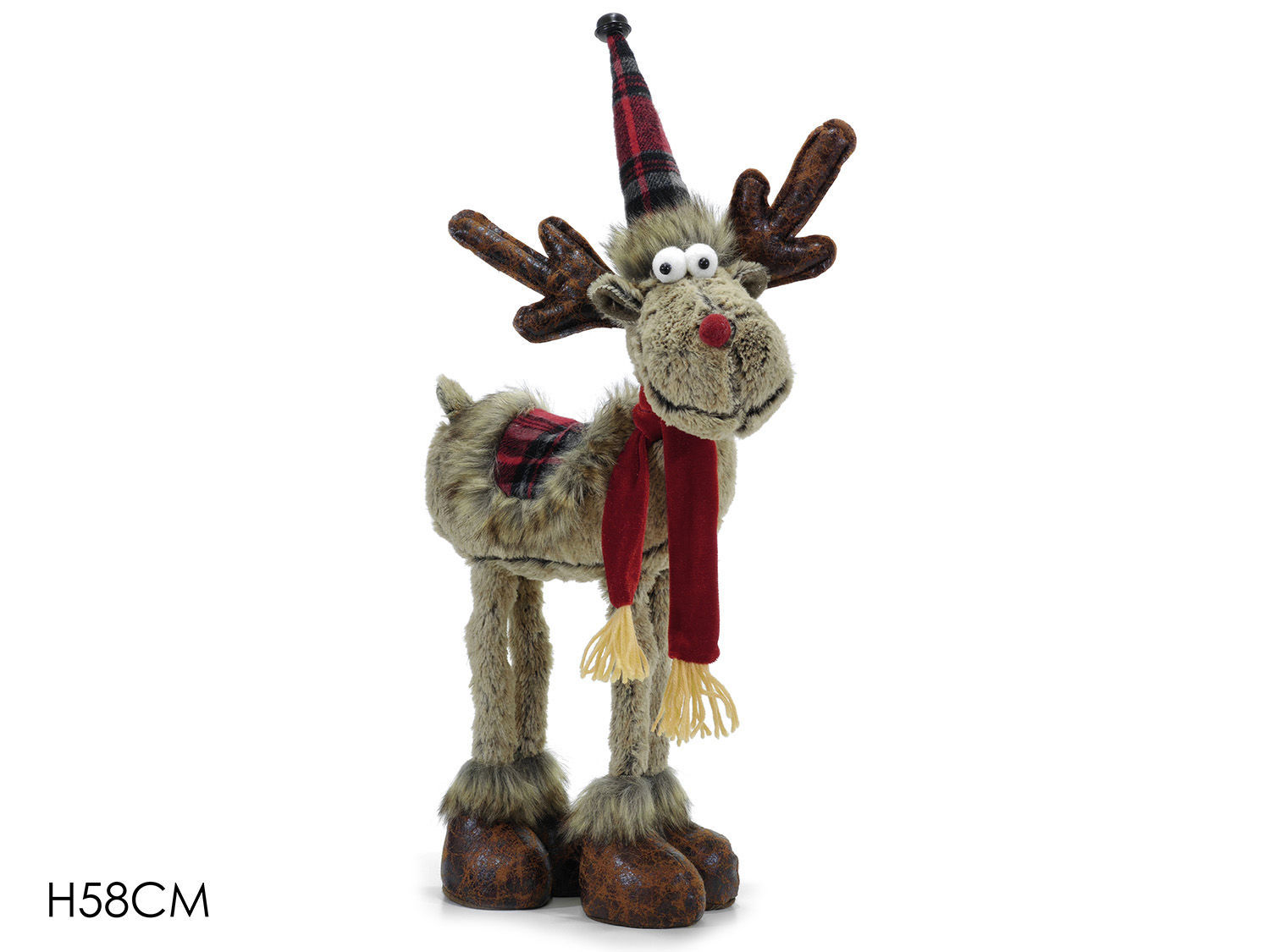 Renna natalizia in piedi alta 58 cm, realizzata in stoffa con sciarpa rossa e cappello lungo a quadri.